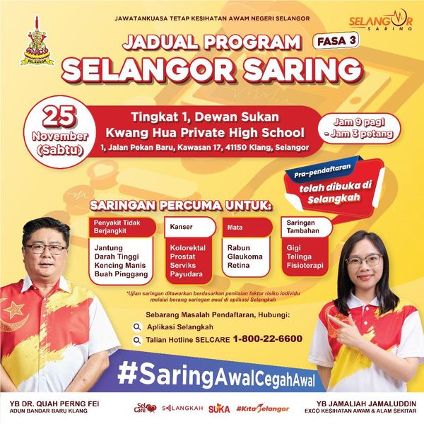 雪兰莪州公共卫生、环境、气候变化及绿色科技行政议员嘉玛丽雅指出,这活动于上午9时至下午12时,在巴生光华独中举行。