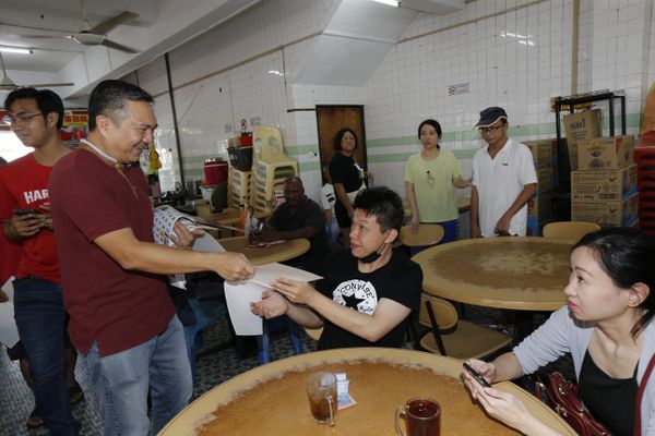 他今早在金銮花园第1区早市巴刹率先派给选民,受到民众热烈欢迎与索取,也有许多选民趁机要求合照。