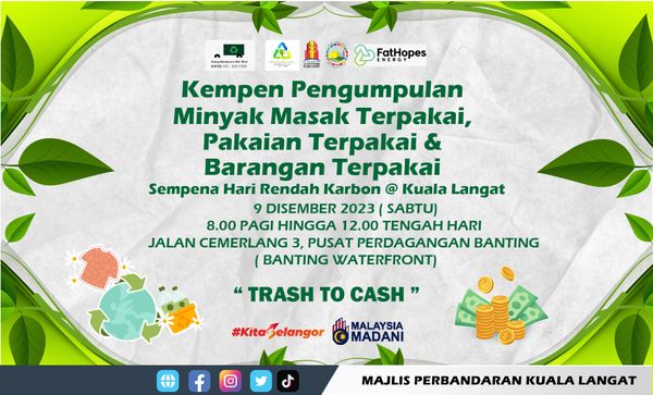 瓜拉冷岳市议会(MPKL)配合瓜拉冷岳低炭日,特于12月9日,上午8时至中午12时,在万津商业中心3路(Banting Waterfront)举办“垃圾变现金”运动。