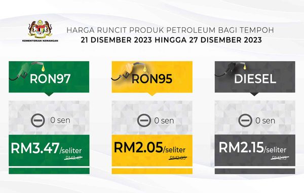 此外,RON95油价每公升维持在2令吉5仙,柴油每公升维持在2令吉15仙。