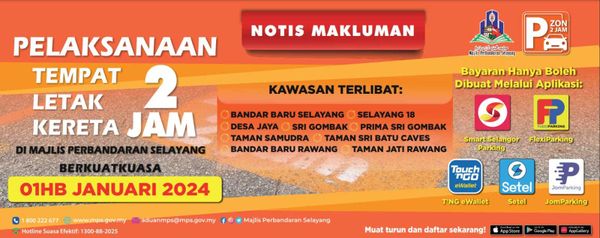 (莎阿南28日讯)士拉央市议会(MPS)将于2024年1月1日起,在9个地区实施限时泊车2小时措施。
