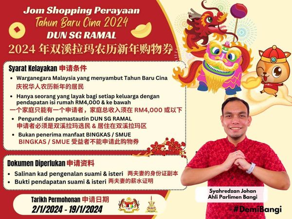 万宜区国会议员谢瑞詹在脸书贴文表示,凡定居在双溪拉玛州选区的华裔选民,只要符合资格皆可申请农历新年购物劵。