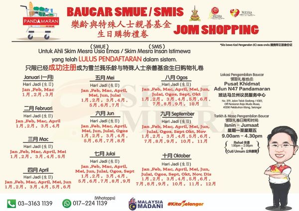 (莎阿南2日讯)班达马兰州选区的雪州乐龄亲善基金(SMUE) 和雪州特殊人士亲善基金(SMIS)会员,即日起可前往班达马兰区州议员梁德志服务中心领取2024年的150令吉生日购物劵。