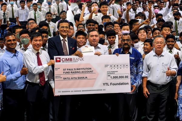 陆兆福较早前移交杨忠礼基金会(YTL Foundation)捐献的100万令吉模拟支票给圣保罗国中。
