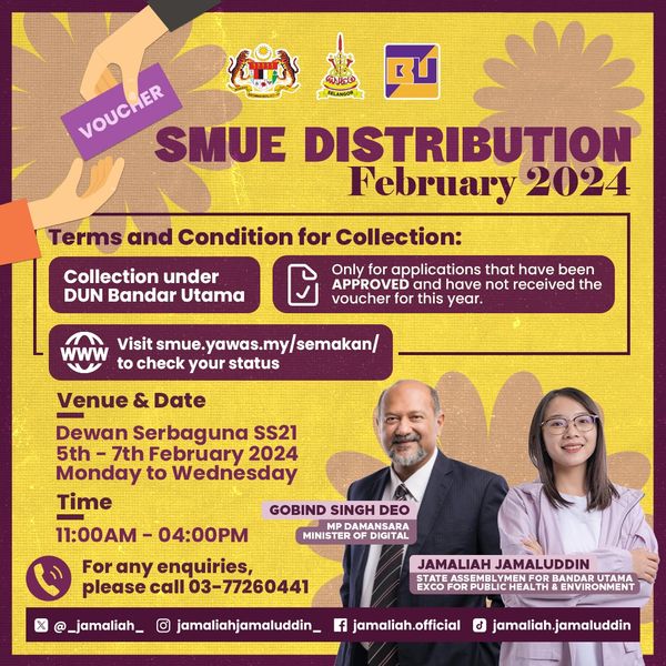 (莎阿南19日讯)万达镇区州议员服务中心宣布,由于过去两天领取雪州乐龄亲善基金(SMUE)购物券的人数众多,为此原定于今天发放的推迟至2月5日至2月7日举行。