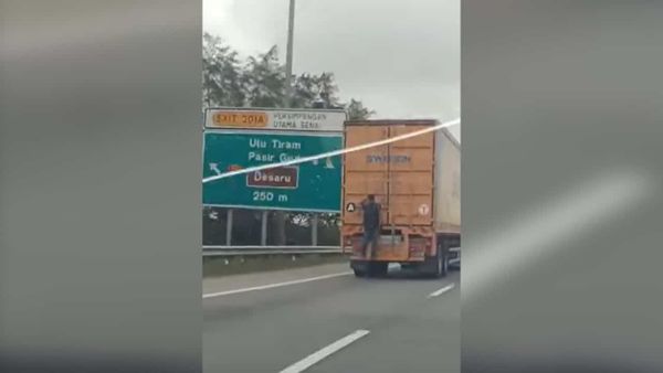 (新山18日讯)双手紧握行驶中拖格罗里后方的横杠,男子貌似搭“顺风车”的危险动作引起警方关注。