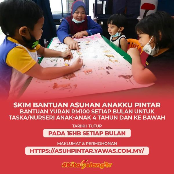 “凡家中育有4岁或以下孩子的家长,可申请由雪州政府推出的托育辅助计划(ASUH PINTAR),每月申领100令吉托儿补贴以减轻开销。”