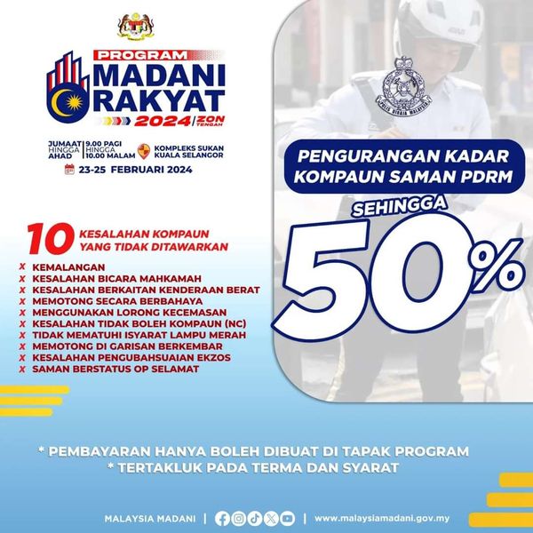 (吉隆坡21日讯)配合本周五(23日)起开跑的中区人民昌明活动(MADANI Rakyat),民众可在现场享有特定交警罚单50%折扣的优惠。
