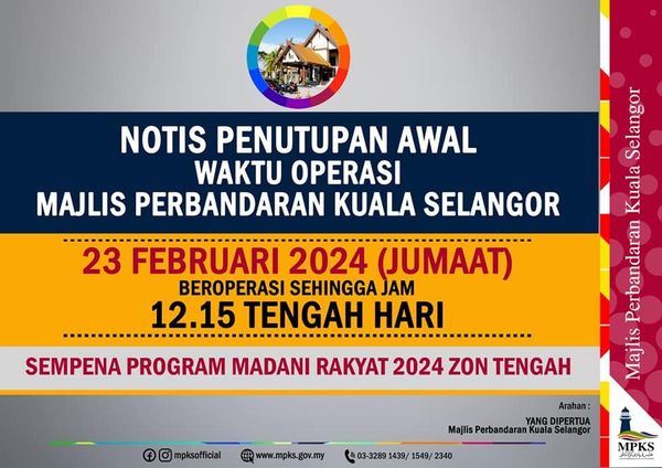 (莎阿南22日讯)中区人民昌明活动(MADANI Rakyat)将于明日(23日)在瓜拉雪兰莪体育馆举行,瓜拉雪兰莪市议会(MPKS)当天的办公时间配合活动仅直至中午12时15分。