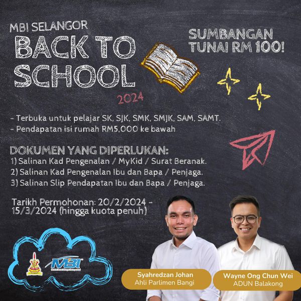 雪州56个州选区将各获得300个名额,受惠学生各获得100令吉后以添购校服和开学用品,家长可以通过雪州各州议员和选区协调官服务中心申请这项援助金。