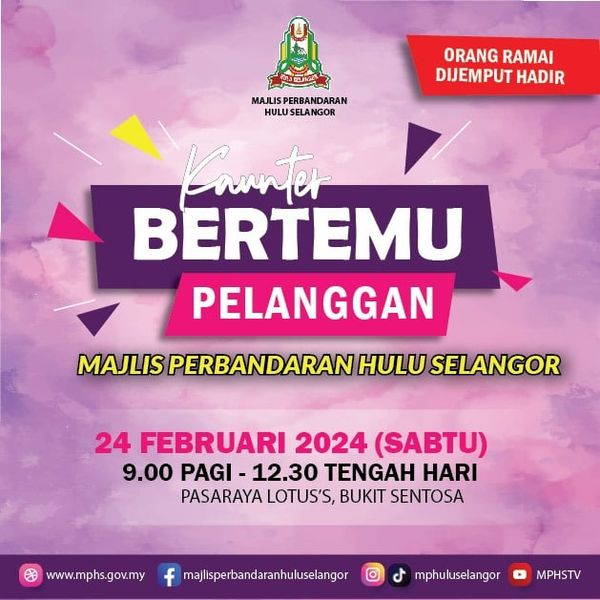 (莎阿南22日讯)乌鲁雪兰莪市议会本周六(24日)将在桃源岭的莲花超市(Lotus)购物中心举办会客日。 乌雪市议会在脸书发帖表示,市议会将在上午9时至中午12时30分,在上述地点开设服务柜台。 市议会欢迎居民届时前来服务柜台寻求咨询和协助。