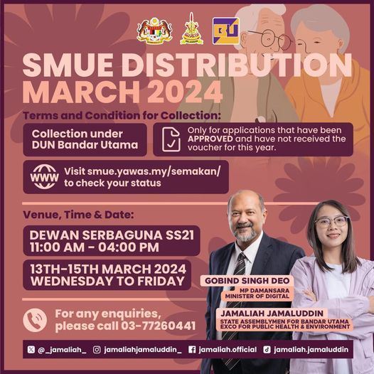 嘉玛丽雅在脸书贴文说,民众可于上午11时至下午4时,到八打灵再也SS21多用途礼堂领取。
