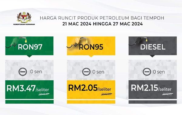 其中,RON97每公升价格维持在3令吉47仙;RON95油价每公升维持在2令吉5仙,柴油价格则维持在每公升2令吉15仙。