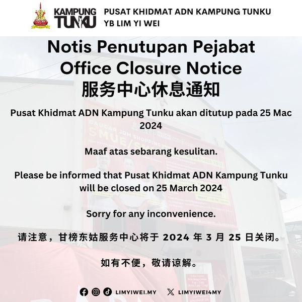 甘榜东姑区州议员林怡威在脸书发帖表示,甘榜东姑区州议员服务中心将于明日(25日)休息一日。