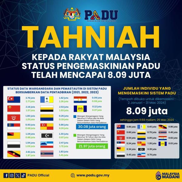 另外,霹雳累积78万人已登记和更新PADU、沙巴(70万人)、吉打(60万人)、吉兰丹(54万人)、吉隆坡(48万人)、彭亨(45万人)、登嘉楼(39万人)、森美兰州(34万人)、马六甲(24万人)、玻璃市(9万人)、布城(3万人)和纳闽(2万人)。