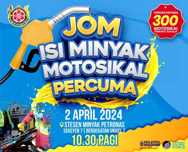 莎阿南市政厅在脸书发帖宣布,“一起为摩托车免费添油”活动将于4月2日上午10时30分,在莎阿南第17区的马石油油站(靠近Unisel)举行。