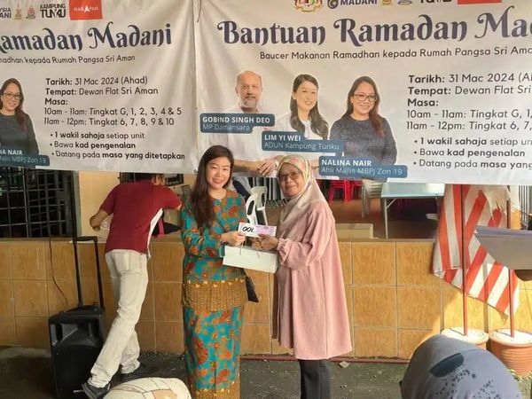 (八打灵再也31日讯)甘榜东姑区州议员林怡威携手八打灵再也市议员派发各100令吉购物券给斯里阿曼组屋的340名居民,以减轻居民的生活负担。