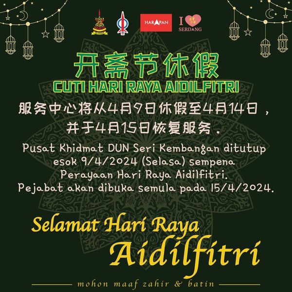 史里肯邦安区州议员王诗棋和中路区州议员玛丽安在脸书发帖表示,服务中心配合开斋节假期将从4月9日至14日期间休假。