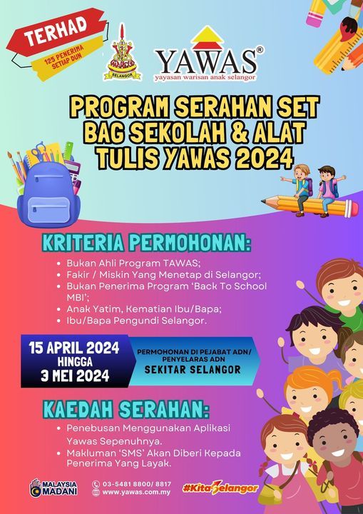 (莎阿南9日讯)雪兰莪州子民基金(YAWAS)将展开2024年开学书包与用品活动,欢迎有需要家长提出申请。