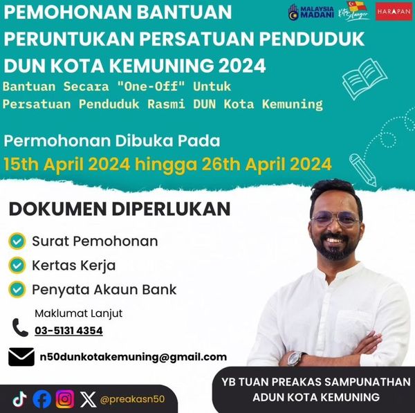 (莎阿南15日讯)由哥打肯文宁区州议员峇卡斯提供的2024年度一次性特别拨款即日起开放给选区内的居民协会申请,以携手打造更安全及舒适的社区环境。