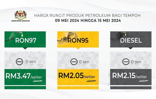其中,RON97每公升价格维持在3令吉47仙;RON95油价每公升维持在2令吉5仙,柴油价格则维持在每公升2令吉15仙。