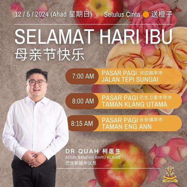 柯鹏飞在脸书发帖表示,团队将于母亲节当天在3个早市派发礼物给母亲,分别于上午7时在河边路早市、上午8时在巴生卫星市早市,以及上午8时15分则来到巴生永安镇早市。