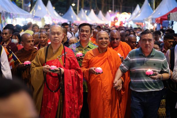 在周三举行的十五碑佛寺花车游行吸引了5万人参与,信众在吉隆坡市中心步行12公里后,再返回十五碑佛寺。