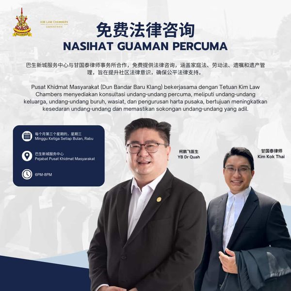 (莎阿南20日讯)巴生新城区州议员柯鹏飞服务中心将于每月第三个星期三提供免费法律咨询,欢迎有需要的民众前来求助。