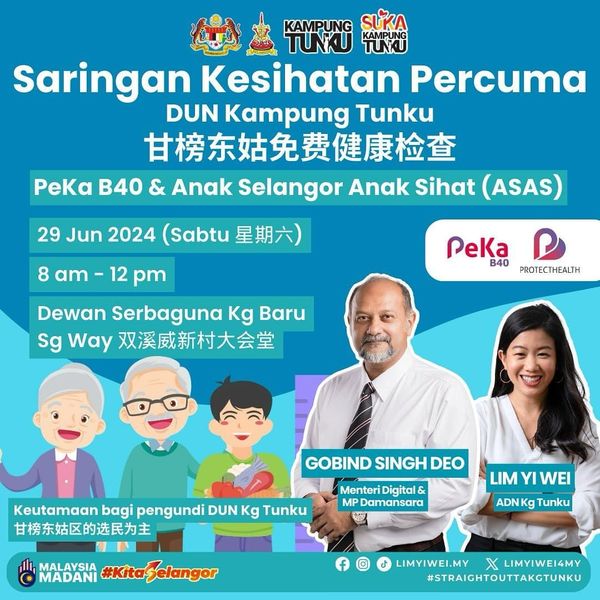 林怡威在脸书发帖表示,这项免费健康检查只限40岁以上的慈悯援助金 (STR) 受惠者,以及雪州儿童健康计划(ASAS)的2岁至12岁的孩童。