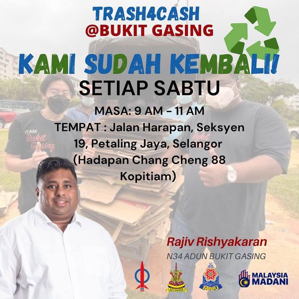 拉吉夫在脸书发帖表示,垃圾换现金活动将于每个星期六上午9时至上午11时,在长城88美食中心前举办。