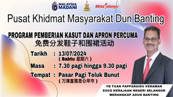 (莎阿南12日讯)万津区州议员巴巴莱都服务中心明天(13日)将来到直落昆仑早市,免费派发鞋子和围裙。 巴巴莱都在脸书发帖宣布,服务中心将在当天上午7时30分至上午9时30分,在直落昆仑早市举办上述活动。 “欢迎万津的所有居民前来领取。”