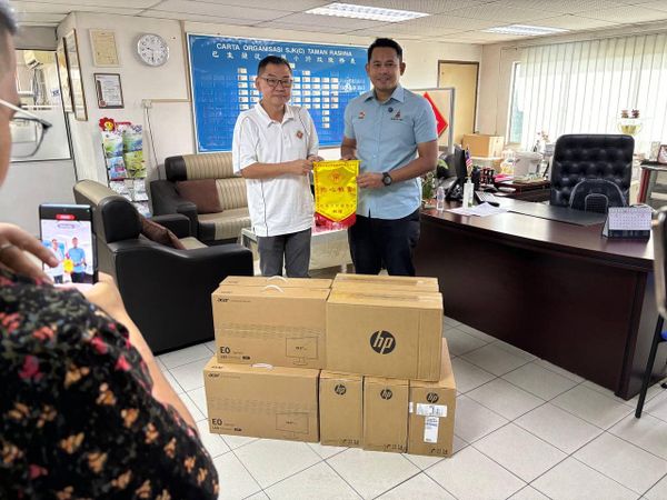 (莎阿南26日讯)峇都知甲区州议员丹尼尔哈仑捐赠5台电脑予巴生兰花园华小的教师。