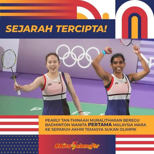 “恭喜马来西亚羽毛球队女双组合陈康乐与蒂娜姐妹创造了历史,成为大马第一支进入奥运半决赛的女双队伍。