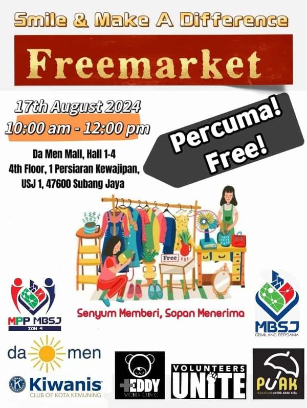 (莎阿南13日讯)USJ 1大门广场(Damen)于8月17日(星期六)举办“免费市集”(FREE MARKET),让有需要者免费拿在场所需的物品。