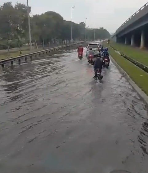 (莎阿南22日讯)大涨潮来袭,新北巴生海峡大道(Lebuhraya Grand Sepadu)第2.8公里处出现突发水灾,引发长达5公里的车龙!