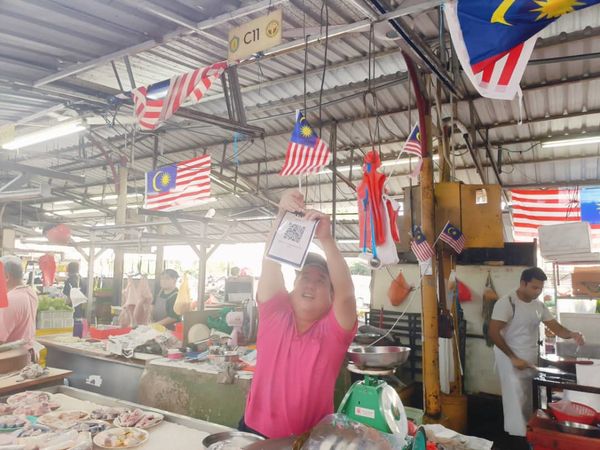 现场所见,不少小贩拿到手摇国旗后就纷纷高挂在摊位,也有居民高呼“默迪卡”,场面乐融融。