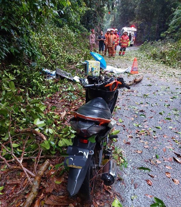(关丹20日讯)一名柬埔寨籍冰淇淋小贩昨天骑着摩托车穿过磐清瀑布路(Jalan Air Terjun Panching)时,被倒下的树木击中身亡。