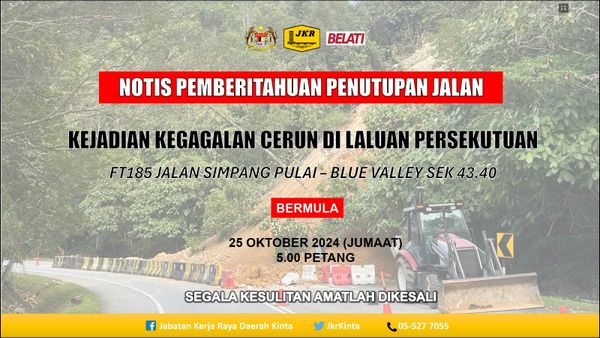 怡保警区主任阿邦再纳阿比丁助理总监发文告指出,上述路段的来回车道已经于今天下午5时关闭,以让路给公共工程局(JKR)进行清理工作,警方会派员进行交通管控工作。
