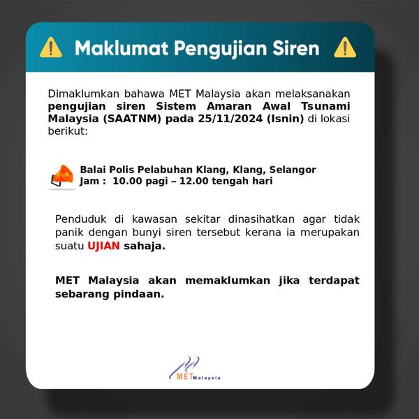 大马气象局今日在脸书贴文,呼吁地方居民勿对系统所发出的声音感到惊慌,并表示这只是测试而已。