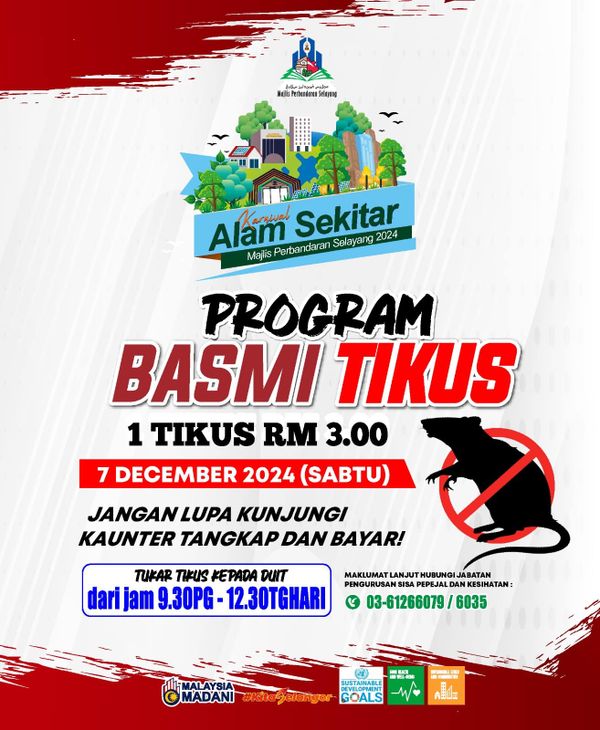 配合2024年环保嘉年华活动,以及杜绝管辖区内的鼠患,士拉央市议会(MPS)将于12月7日(星期六)举行“消灭老鼠,老鼠换现金活动”(“Program Basmi Tikus: Tukar Tikus Kepada Duit”)。