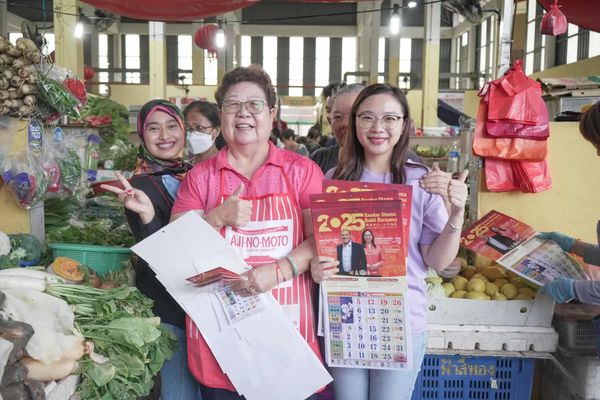 雪州行政议员黄思汉(左)于2024年12月16日,派发月历给早市小贩时,不忘与民众交流。(图/黄思汉脸书)[/caption]