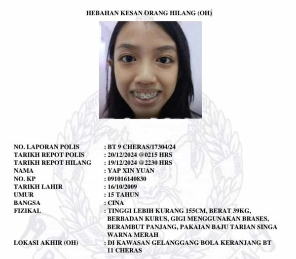 根据媒体报道,15岁的女中生叶馨媛于2024年12月19日告知家人要前往蕉赖路11英里一个篮球场练习舞狮后便失去音讯,令家人心急如焚。
