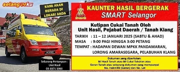 (莎阿南10日讯)巴生县土地局于本周未日(11日至12日)来到班达马兰村管会礼堂前面设临时柜台,欢迎民众把握机会缴交土地税。
