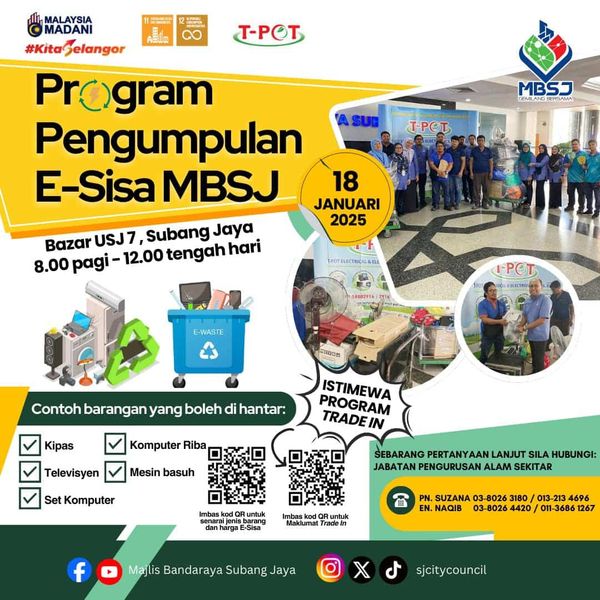 (莎阿南17日讯)梳邦再也市政厅(MBSJ)将在明天(18日)举办电子垃圾回收活动,欢迎民众将家中的各类电子垃圾送往活动现场,以换取奖励。