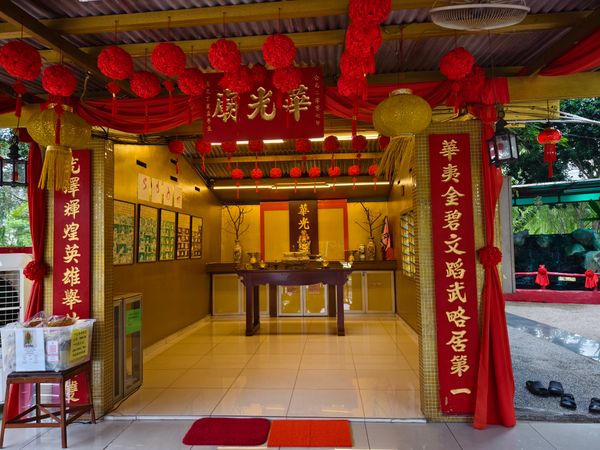 华光太帝祖师庙占地约一英亩半,设计独具特色,四周以荷花、竹林和柳树装点,中央有鲤鱼池,环境幽静。
