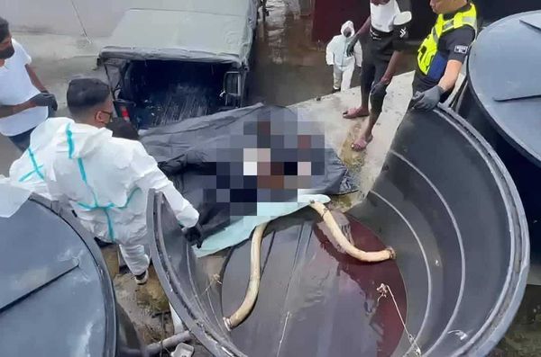 霹雳邦咯岛一个大型储水桶于2025年2月4日发现男尸,死者当时面部朝下。(图 / Info Maklumat Terkini 脸书)[/caption]