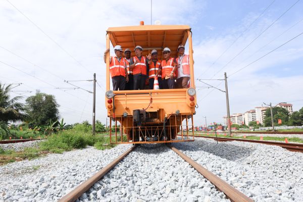雪州行政议员黄思汉(中)于2025年2月27日在巴生港口巡视第二期巴生谷双轨铁道基建提升工程工地时,视察轨道情况。(摄影:NUR ADIBAH AHMAD IZAM/MEDIA SELANGOR)[/caption]