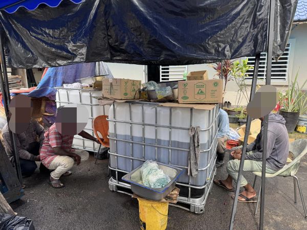 “经过3个月的情报搜集,官员于昨日下午4时取缔士毛月再也花园一间场所,当场逮捕这群男子。调查发现,该场所除了用于建筑施工,也充当仓库储存和转运补贴食用油。”