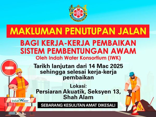 (莎阿南17日讯)由于英达丽水(IWK)维修工程出现技术问题,莎阿南第13区的阿夸迪大路(Jalan Persiaran Akuatik)将延长关闭至3月21日。