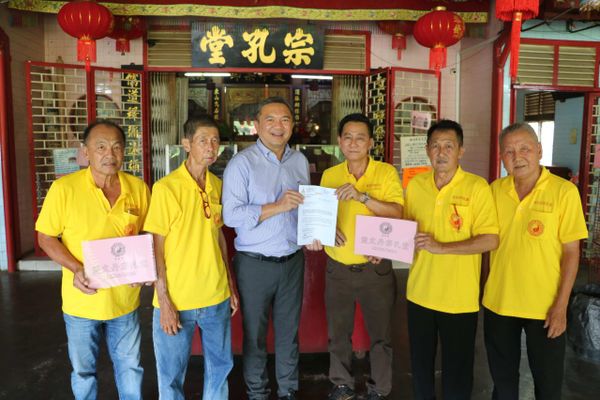 雪兰莪州佛教、基督教、兴都教、锡克教与道教委员会(LIMAS)联合主席黄思汉日前拜访拥有60年历史的双文丹宗孔庙时,把土地宪报书移交给庙方,并由主席马瑞发、副主席徐樶桦和一众理事接领。
